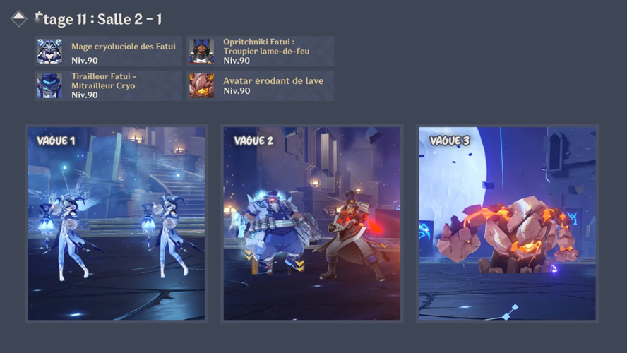 Pour optimiser vos chances, il est vivement conseillé d’utiliser des personnages pyro afin d’éliminer rapidement les boucliers de glace. En complément, des héros anémo capables de regrouper les ennemis, comme Venti, Kazuha ou Sucrose, sont très efficaces.