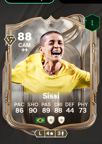 Introducing Sissi's Icon card, an elite Central Attacking Midfielder boasting an impressive overall rating of 88. With exceptional attributes including a 90 in shooting, 89 in passing, and 88 in both dribbling and pace, this card embodies a complete offensive orchestrator. As a CAM, Sissi's primary advantage lies in her sharp attacking prowess and creative genius; her pinpoint passing and clinical finishing allow her to dissect defensive lines, create decisive opportunities, and seal the game with crucial goals, making her an indispensable playmaker in any squad.