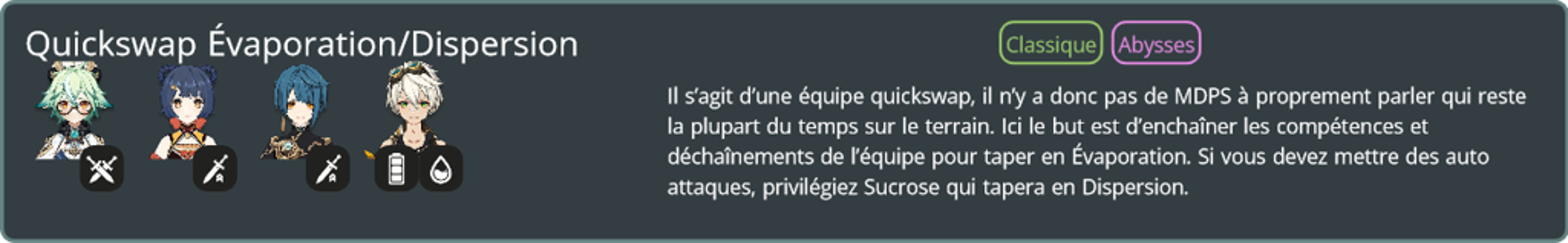 • 1 DPS de zone Cryo/Hydro (pour contrôle et réaction) + 1 Anémo pour regrouper + 1 Électro pour neutraliser les structures + 1 heal.